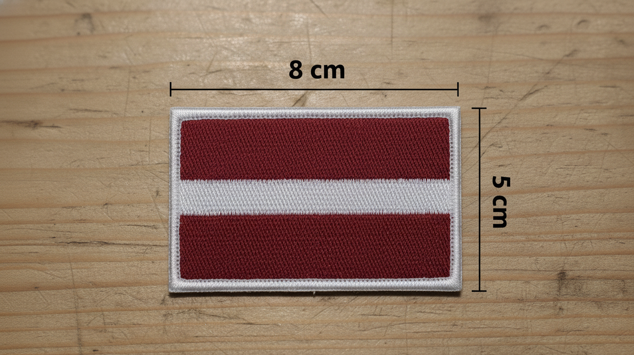 Patch bordado da Bandeira da Letônia, ideal para personalizar roupa, mochilas, casacos ou equipamentos táticos. Fabricado em material resistente e com sistema de fixação Hook & Loop (velcro), é simples de aplicar e remover sem necessidade de costura. Mede 8 x 5 cm, destacando-se pelo design detalhado e pela durabilidade.