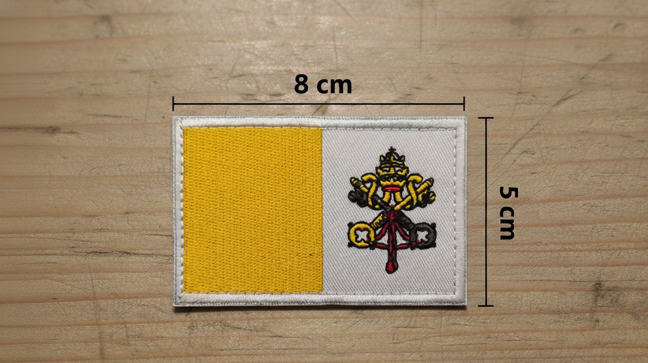 Patch bordado da Bandeira do Vaticano, ideal para personalizar roupa, mochilas, casacos ou equipamentos táticos. Fabricado em material resistente e com sistema de fixação Hook & Loop (velcro), é simples de aplicar e remover sem necessidade de costura. Mede 8 x 5 cm, destacando-se pelo design detalhado e pela durabilidade.